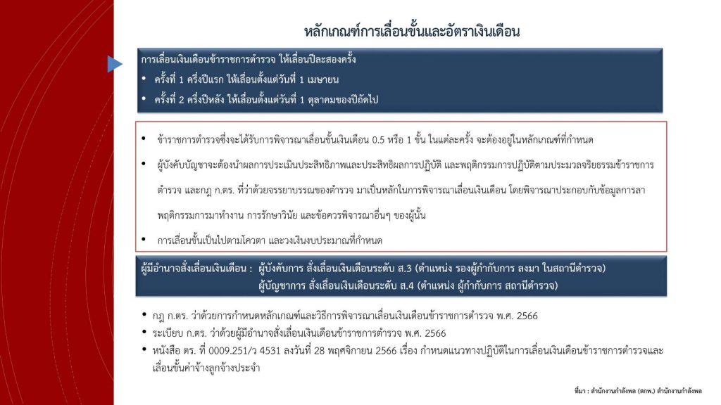 – กฎ ก.ตร.ว่าด้วยการกำหนดหลักเกณฑ์ และวิธีการพิจารณาเลื่อนเงินเดือนข้าราชการตำรวจ พ.ศ.2566 คลิกอ่าน